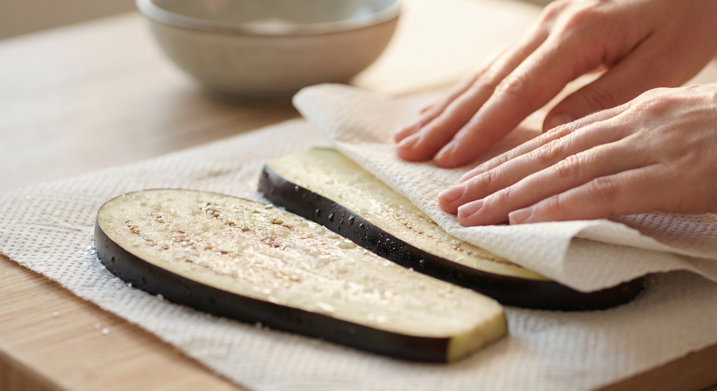 - Heize den Backofen auf 200°C Ober-/Unterhitze vor. Schneide die Aubergine in ca. 0,5 cm dicke Scheiben. Lege sie auf Küchenpapier und bestreue sie leicht mit Salz. Lass sie etwa 10 Minuten Wasser ziehen, damit sie später nicht so viel Öl aufsaugen.