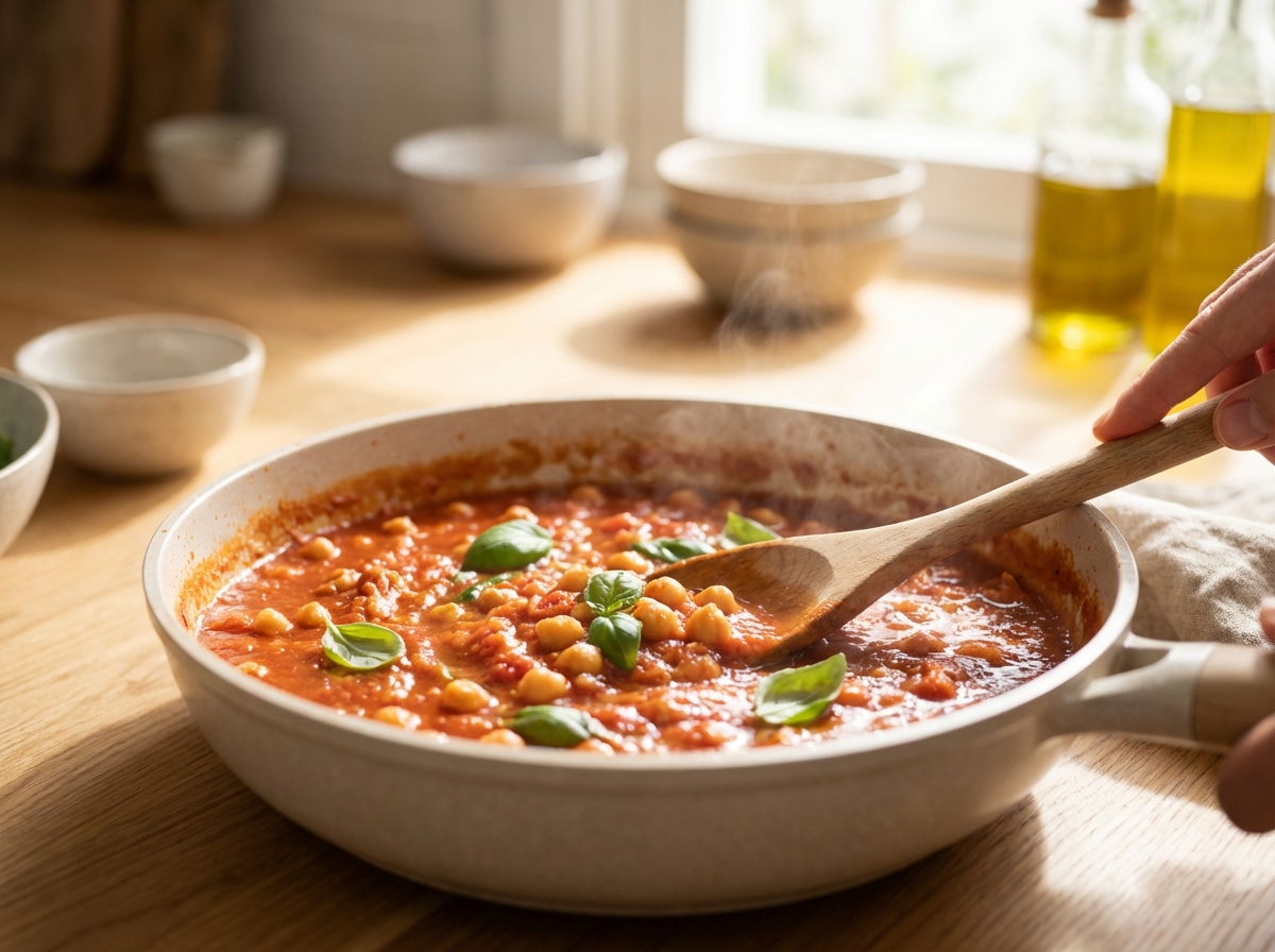 - Gib die passierten Tomaten, Gemüsebrühe, Oregano und Basilikum dazu. Lass die Sauce unter gelegentlichem Rühren etwa 5 Minuten köcheln. Schmecke sie mit Salz und Pfeffer ab. Rühre zum Schluss die abgetropften Kichererbsen unter.