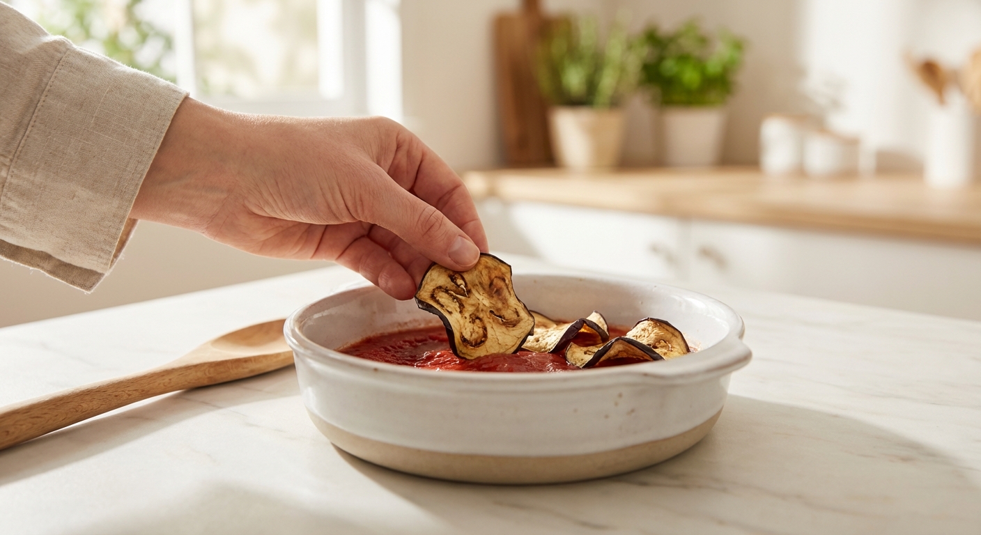 - Tupfe die Auberginenscheiben gut trocken. Lege den Boden einer kleinen Auflaufform (ca. 20×15 cm) mit einem Teil der Tomatensauce aus. Lege eine Schicht Auberginenscheiben darauf.