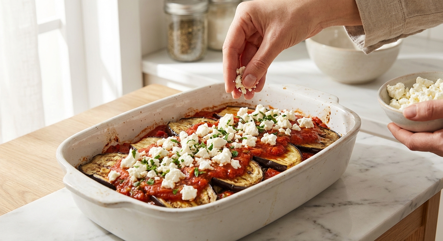 - Brösele etwa die Hälfte des Fetas über die Auberginen. Wiederhole die Schichten: Sauce, Auberginen und dann den restlichen Feta.