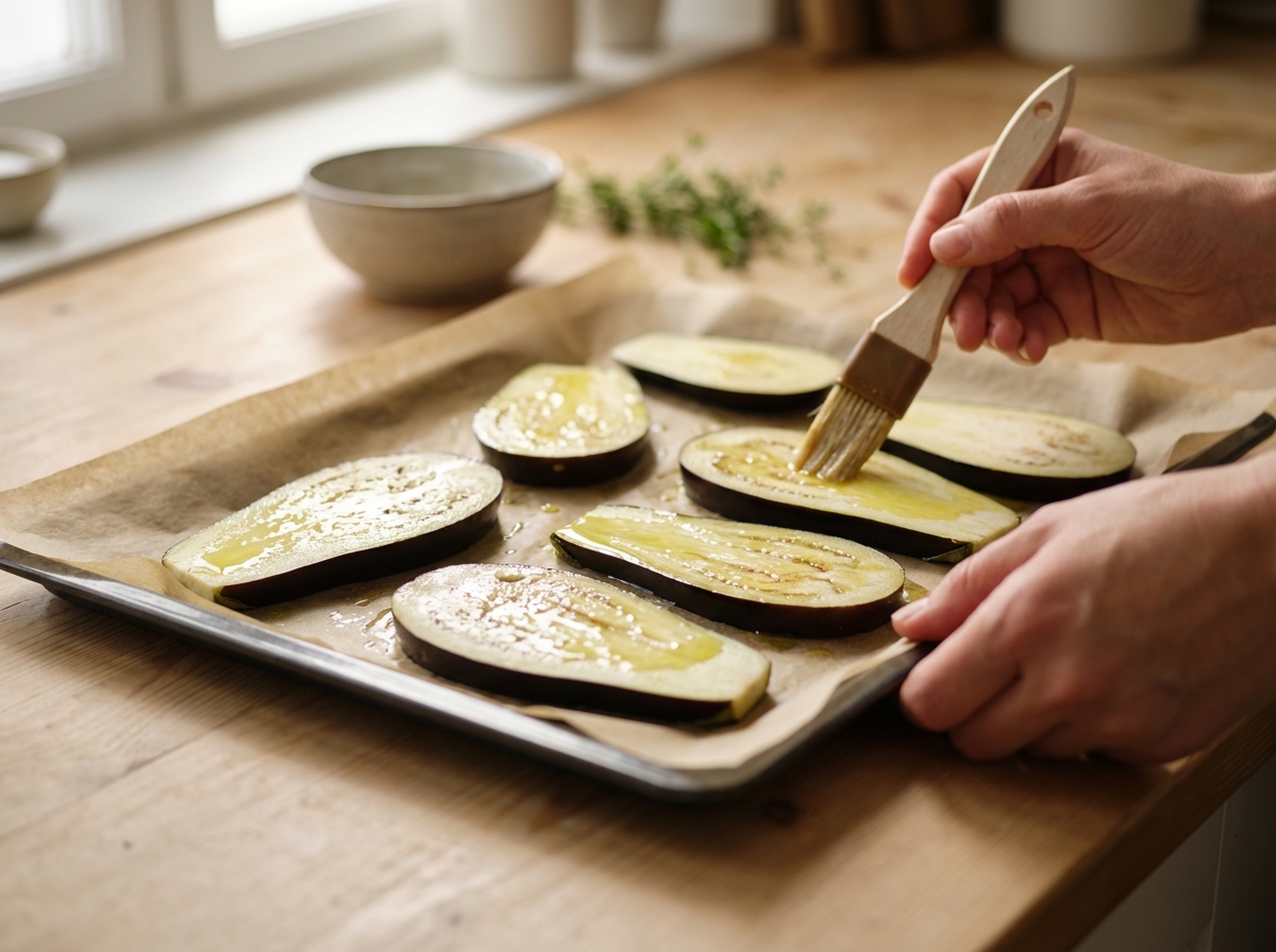 - Heize den Backofen auf 200°C Ober-/Unterhitze vor. Schneide die Aubergine in ca. 0,5 cm dicke Scheiben. Lege sie auf ein Backblech, bestreiche sie leicht mit Olivenöl, salze und pfeffere sie. Backe die Auberginenscheiben für ca. 10-12 Minuten, bis sie weich sind. Sie sollen nicht knusprig werden.