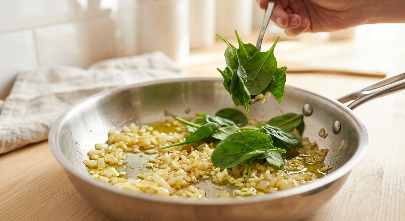 - Während die Auberginen im Ofen sind, bereite die Füllung vor. Erhitze einen halben Esslöffel Olivenöl in einer Pfanne. Brate Zwiebel und Knoblauch darin glasig an. Gib den Spinat dazu und lass ihn zusammenfallen. Drücke überschüssige Flüssigkeit gut aus dem Spinat. Das ist wichtig, sonst wird die Füllung zu wässrig.