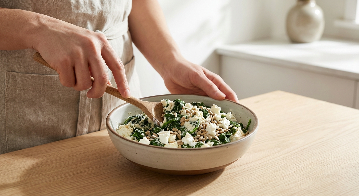 - Nimm den Spinat vom Herd und gib ihn in eine Schüssel. Mische Ricotta, zerbröselten Feta und die Sonnenblumenkerne unter. Schmecke die Füllung mit Salz und Pfeffer ab. Probiere ruhig mal – so stellst du sicher, dass sie perfekt ist!