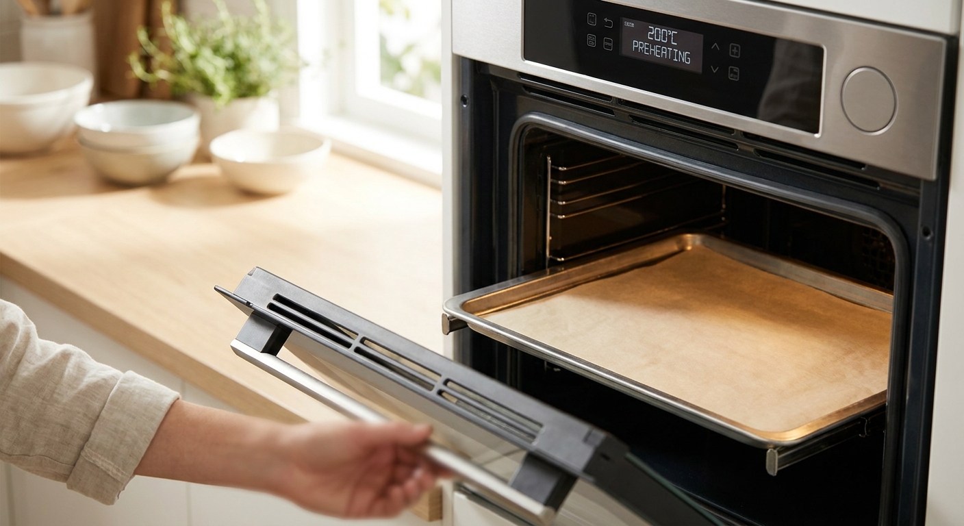 - Heize deinen Backofen auf 200 °C Ober-/Unterhitze vor. Lege ein Backblech mit Backpapier aus, das spart später Abwasch.