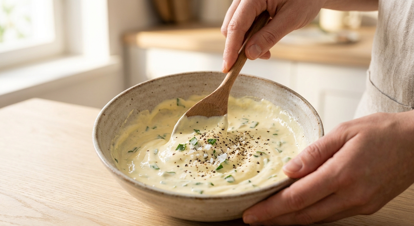 - Schmand – Er macht die Basis unglaublich cremig. Du kannst auch Saure Sahne oder Magerquark/Skyr verwenden, um Kalorien und Fett zu sparen und den Proteingehalt zu erhöhen. Vegane Alternative: Hier gibt es tolle pflanzliche Schmand- oder Crème-frâiche-Produkte.