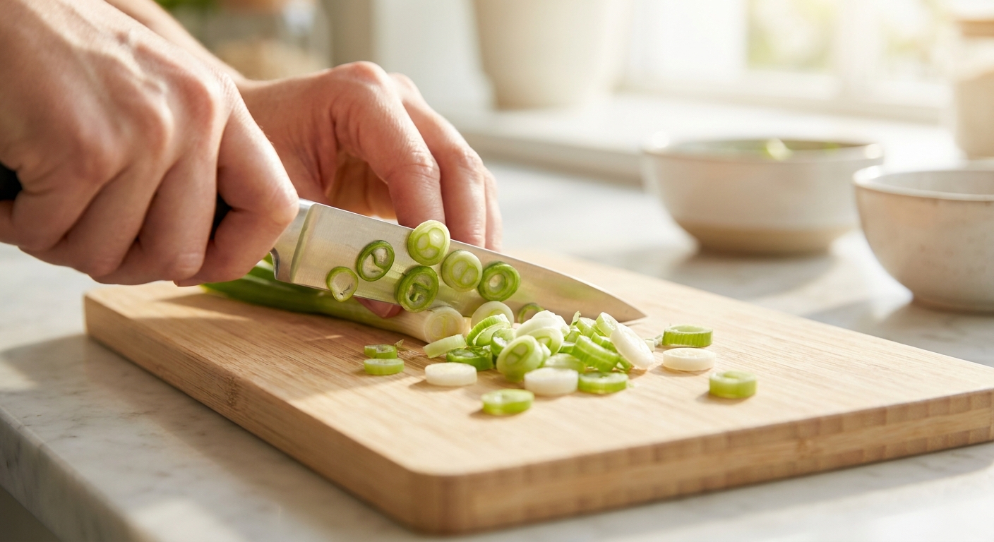 - Während die Fladen backen, wasche die Frühlingszwiebeln und schneide sie in feine Ringe.