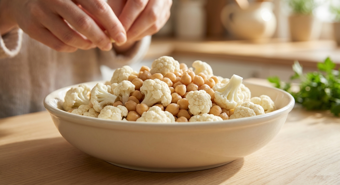 • Wasche den Blumenkohl und teile ihn in mundgerechte Röschen. Gib ihn zusammen mit den abgetropften Kichererbsen in eine große Schüssel.