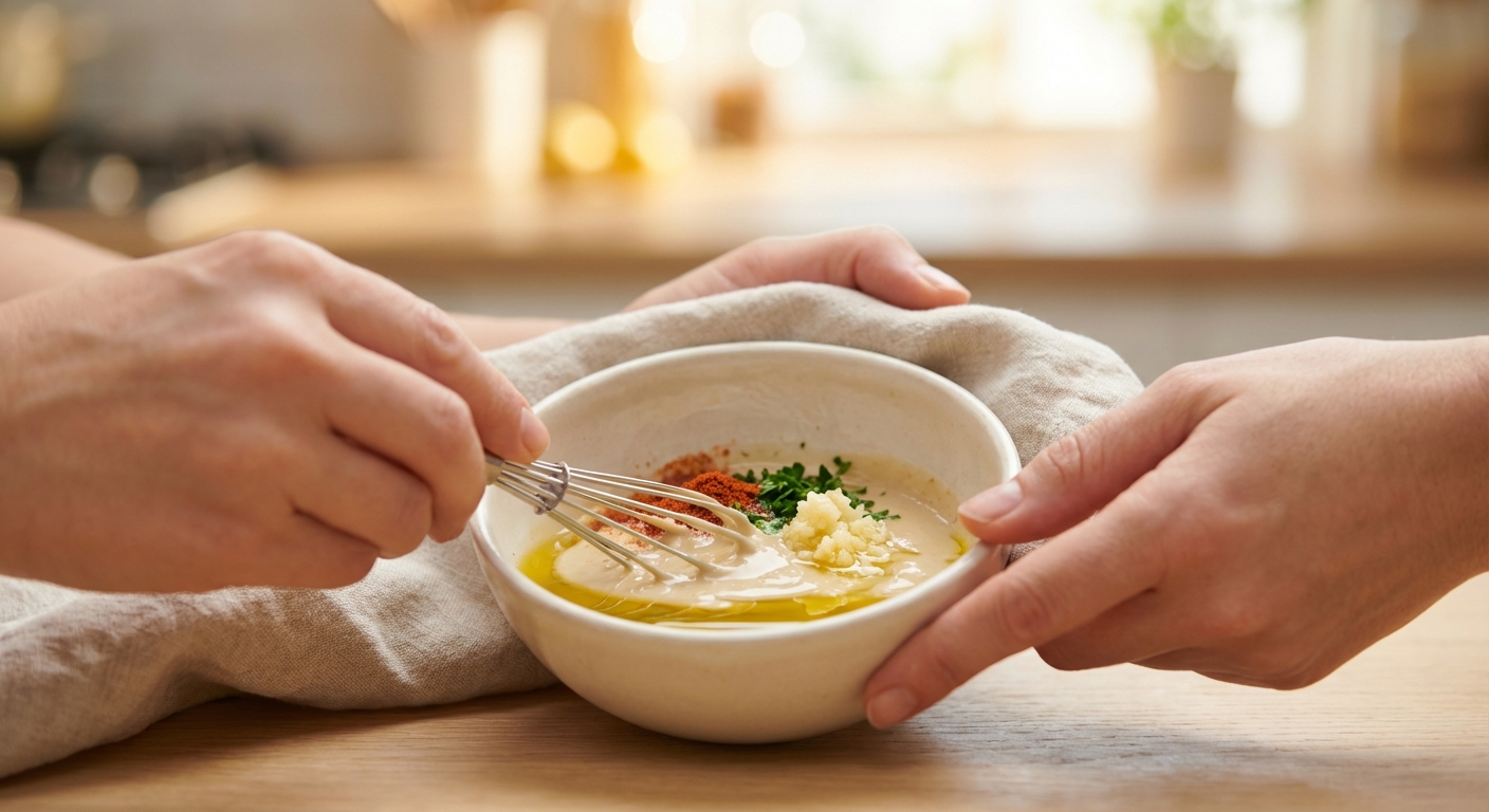 • Rühre das Dressing kräftig mit einem Schneebesen oder einer Gabel. Gib das Wasser esslöffelweise hinzu, bis das Dressing die gewünschte cremige Konsistenz hat. Es sollte flüssig genug sein, um sich gut über den Salat zu verteilen.