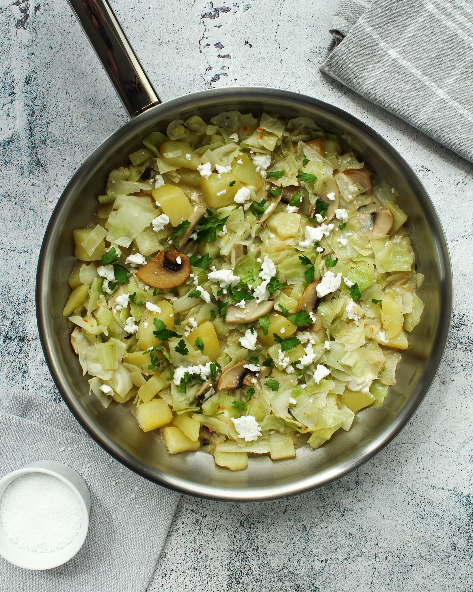 Cremige Spitzkohlpfanne mit Kartoffeln und Feta