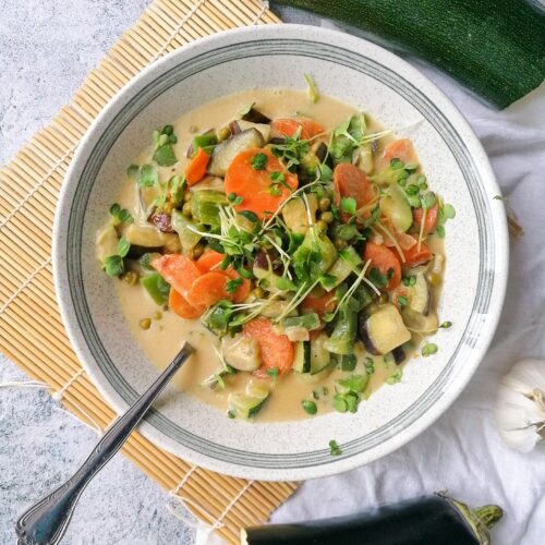 Das wichtigste an diesem Kokoscurry ist die grüne Currypaste. Das Gemüse kannst du nach belieben variieren. So kannst du z.B. auch Bambussprossen oder Soja Sprossen in dein Curry geben.