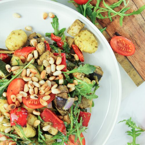 - Gemüse aus dem Ofen holen und in eine große Schüssel geben. Gnocchi sowie Tomaten, Zwiebel und Rucola dazu geben und alles miteinander vermengen. Dressing sowie Pesto darüber geben und unterheben.