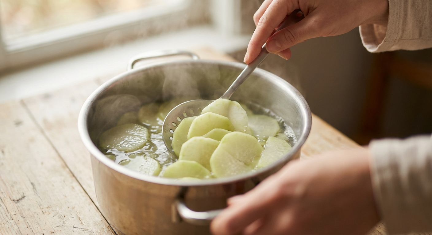 - Schäle den Kohlrabi und schneide ihn in etwa 0,5 cm dicke Scheiben. Du solltest etwa 4-6 Scheiben pro Portion bekommen. Blanchiere die Kohlrabischeiben für etwa 3-4 Minuten in kochendem Salzwasser. Danach mit kaltem Wasser abschrecken und gut abtropfen lassen.