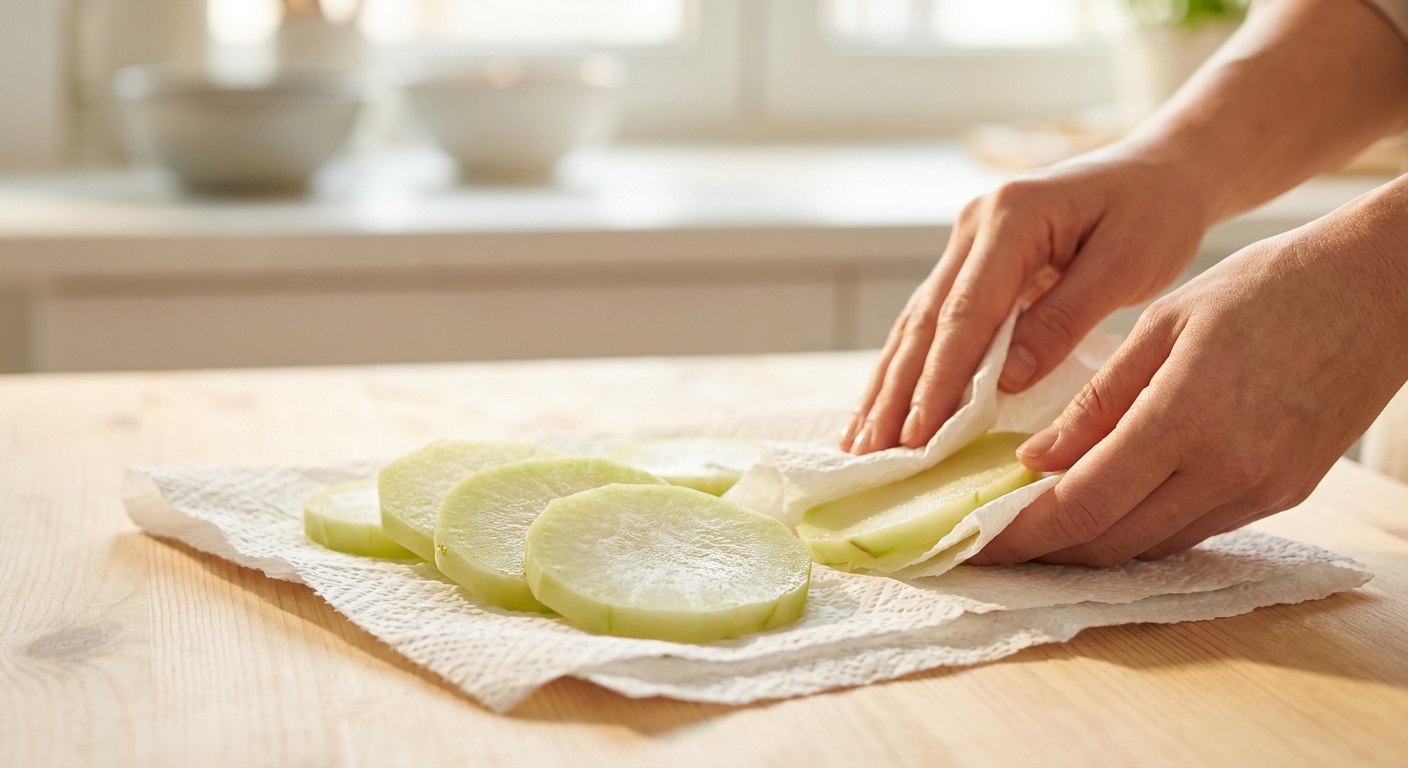 - Lege die blanchierten Kohlrabischeiben auf Küchenpapier und drücke überschüssige Flüssigkeit vorsichtig heraus. Das ist wichtig, damit die Panade gut haftet.
