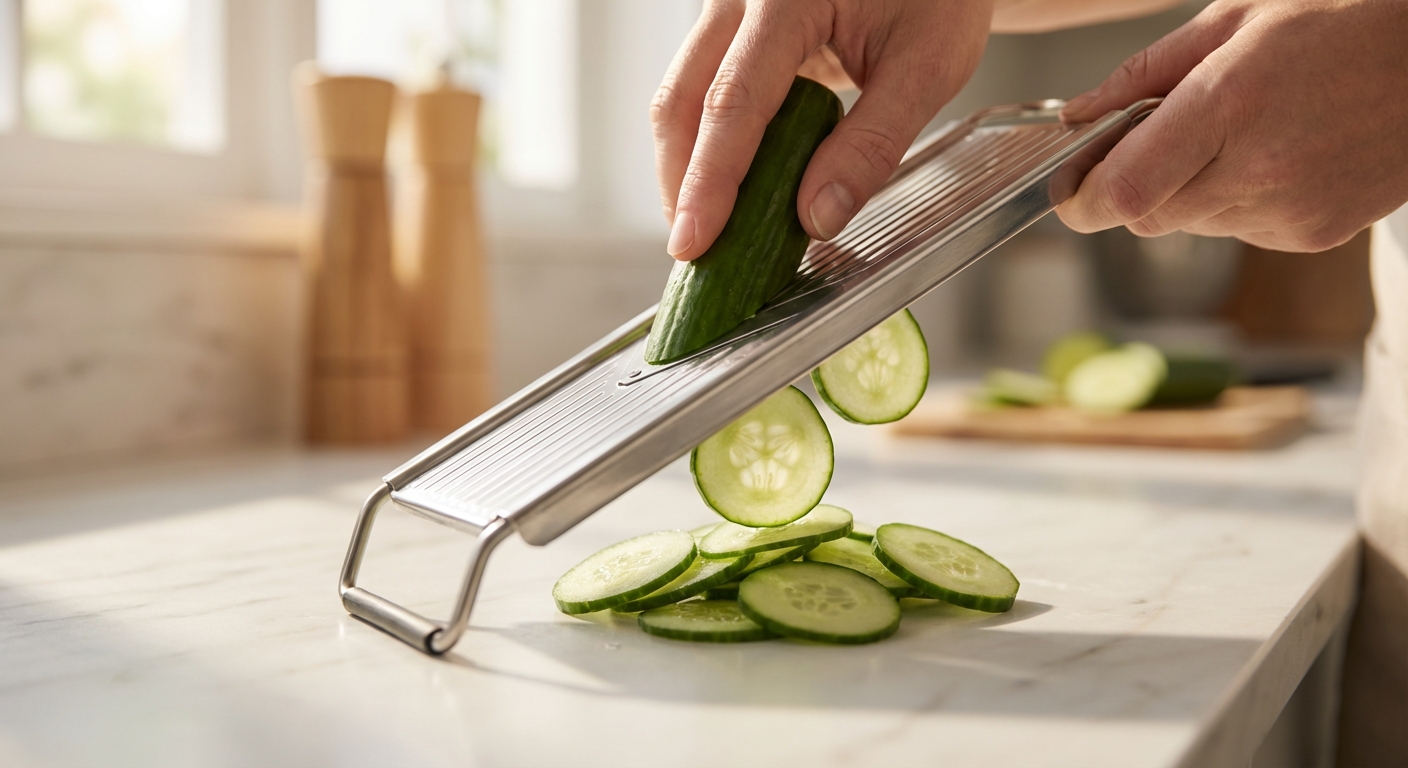 - Wasche die Salatgurke und hoble sie in dünne Scheiben. Du kannst sie auch mit einem Messer fein schneiden. Gib die Gurkenscheiben in eine Schüssel.