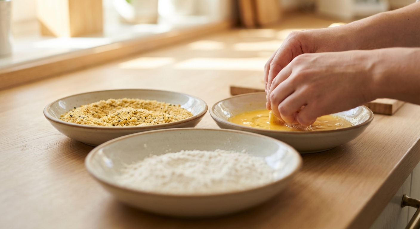 - Bereite drei tiefe Teller vor: In den ersten Teller gibst du das Mandelmehl mit Paprikapulver, Salz und Pfeffer vermischt. In den zweiten Teller verquirlst du das Ei. In den dritten Teller gibst du den geschroteten Leinsamen und Sesam, ebenfalls mit einer Prise Salz vermischt.