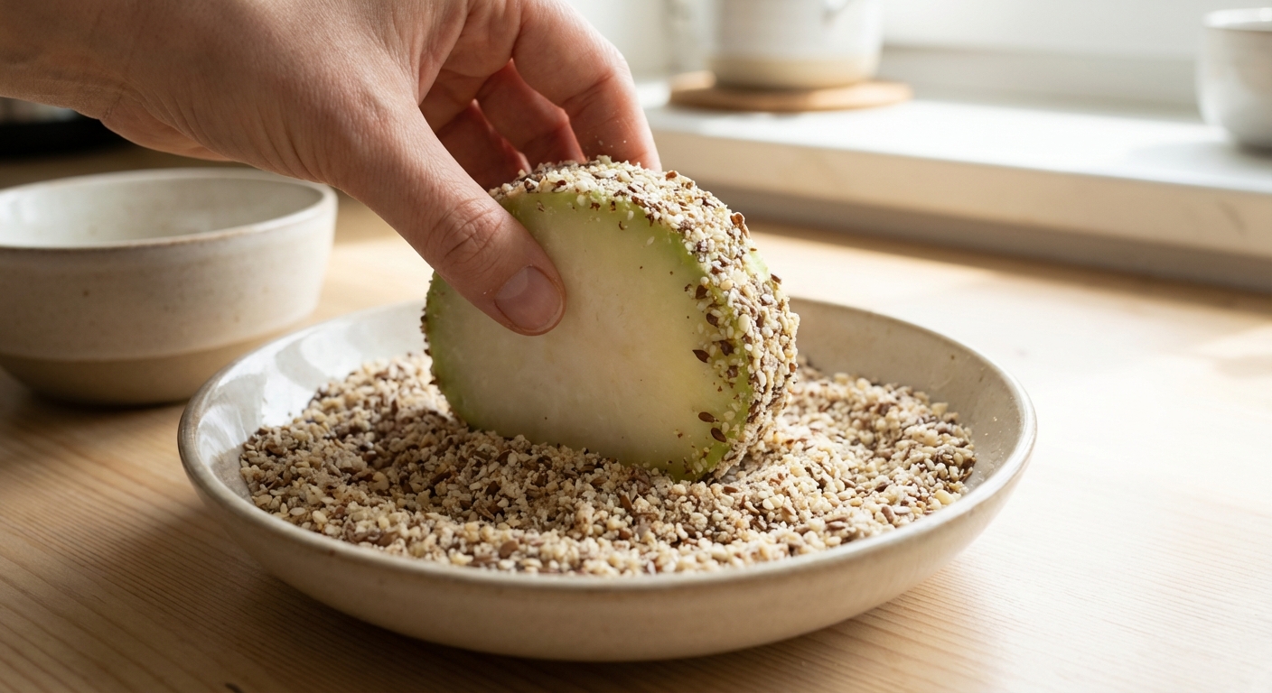- Wende jede Kohlrabischeibe zuerst im gewürzten Mandelmehl, dann im Ei und zum Schluss in der Leinsamen-Sesam-Mischung. Drücke die Panade gut an, damit sie fest haftet.