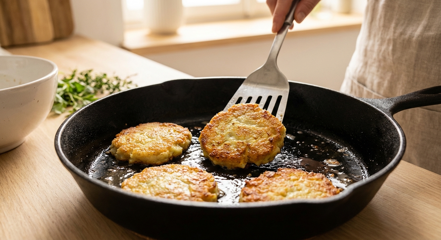 - Erhitze das Pflanzenöl in einer großen Pfanne bei mittlerer Hitze. Gib die panierten Kohlrabi-Schnitzel in die Pfanne und brate sie von jeder Seite für etwa 4-6 Minuten goldbraun und knusprig. Die Schnitzel sollten gar sein, aber noch einen leichten Biss haben.