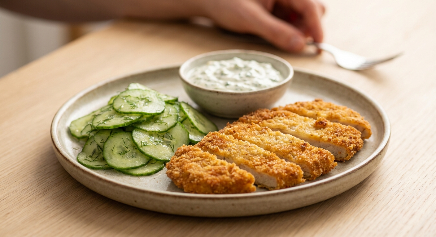 Warum dieses Gericht perfekt für dich ist:- 1. Geschmacklich ein Highlight – Der milde Kohlrabi bekommt durch die knusprige Panade und den cremigen Dip eine ganz besondere Note. Der Gurkensalat bringt die nötige Frische mit.