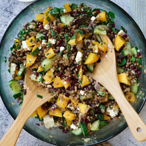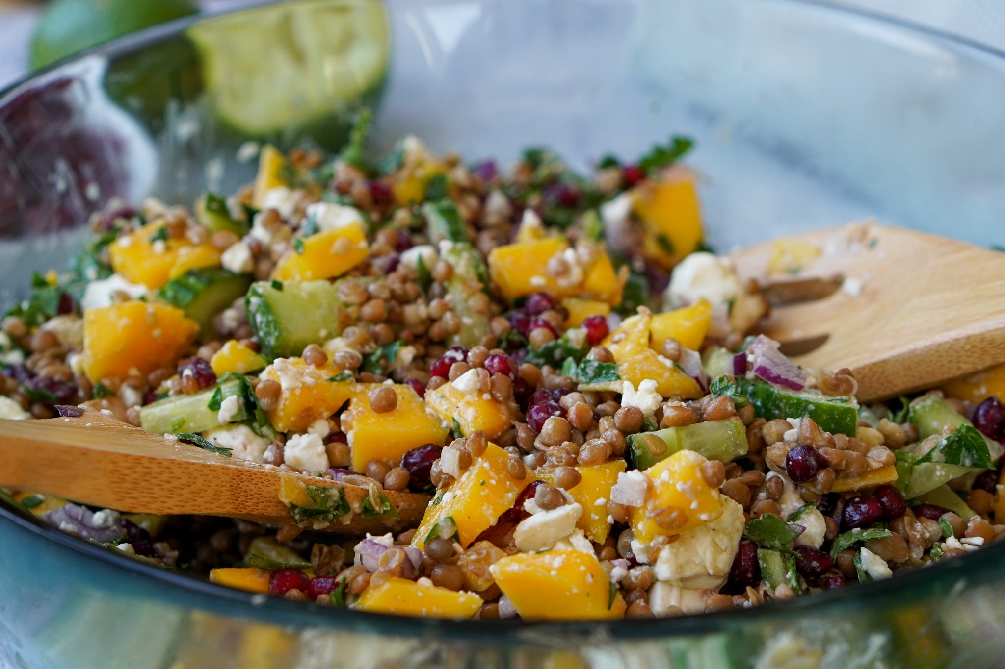 • Linsen zusammen mit der Zwiebel, Gurke und Mango in eine Salatschüssel geben.