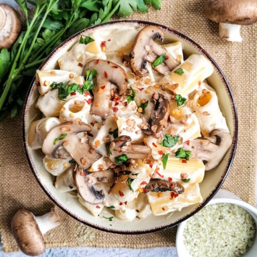 Dieses Rezept ist besonders lecker und ganz einfach herzustellen. Sahne Sauce mit Cashew ist ganz einfach, um eine vegane Sahne Sauce herzustellen. Die Pilze geben einen etwas herben Geschmack dazu und ergeben eine vollständige Mahlzeit. Ich nehme meistens Champignon dazu, jedoch können auch andere Pilzarten verwendet werden. Es eignen sich sogar getrocknete Pilze wie etwa Morcheln. Generell empfehle ich eher frische oder getrocknete Pilze zu verwenden als diejenigen in Dosen. Bei getrockneten Pilze bitte darauf achten, dass diese erst eingeweicht werden müssen. Für die Pasta eignen sich alle Nudelsorten, sei es Spaghetti, Fusilli, Maccharoni oder Fanfare. Für Veganer ist zu beachten, dass Pasta ohne Eier verwendet werden. Traditionelle italienische Pasta wird aus Hartweizenmehl, Wasser und Salz hergestellt. Zum Teil werden in der europäischen Küche den Teig Eier zugefügt, jedoch ist dies nicht nötig.