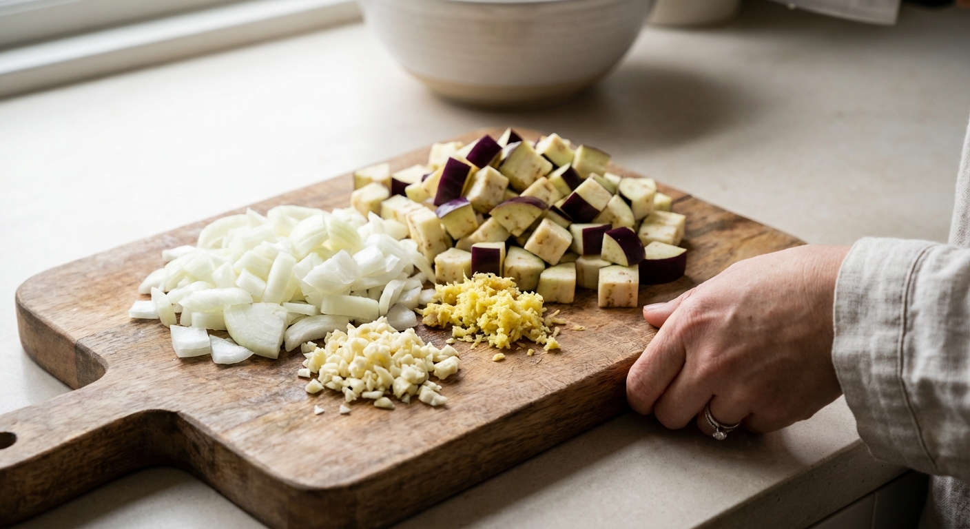 - Zwiebel, Knoblauch und Ingwer schälen und fein hacken. Die Aubergine waschen und in etwa 1-2 cm große Würfel schneiden.