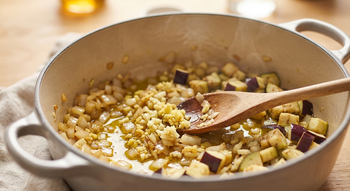- In einem großen Topf oder einer tiefen Pfanne das Olivenöl bei mittlerer Hitze erwärmen. Zwiebeln darin 2-3 Minuten glasig dünsten. Knoblauch, Ingwer und Auberginenwürfel hinzufügen und weitere 5 Minuten mitbraten, bis die Aubergine leicht weich ist.