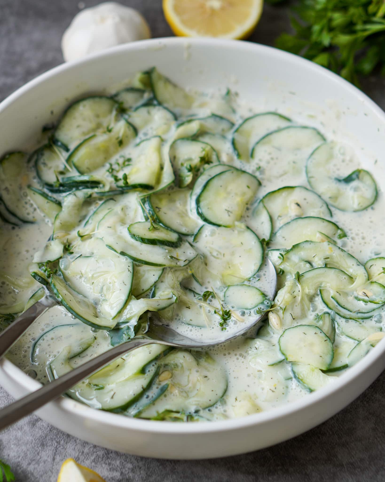 Leichter Gurkensalat mit Joghurt Dressing – vegan und perfekt für eine leichte Sommerküche.