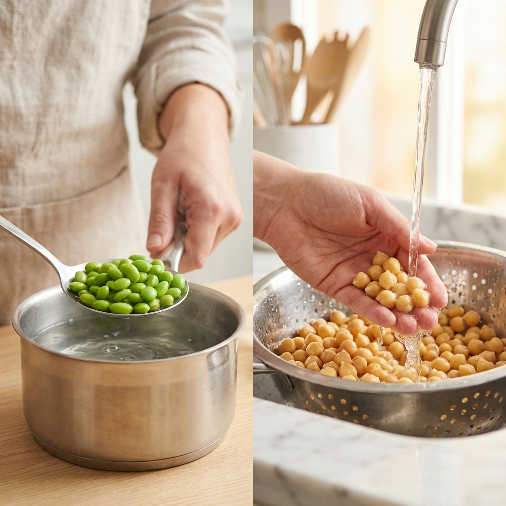 - In der Zwischenzeit die Edamame nach Packungsanleitung zubereiten (meist kurz in kochendem Wasser blanchieren oder auftauen lassen) und anschließend abgießen. Die Kichererbsen gründlich abspülen und abtropfen lassen.