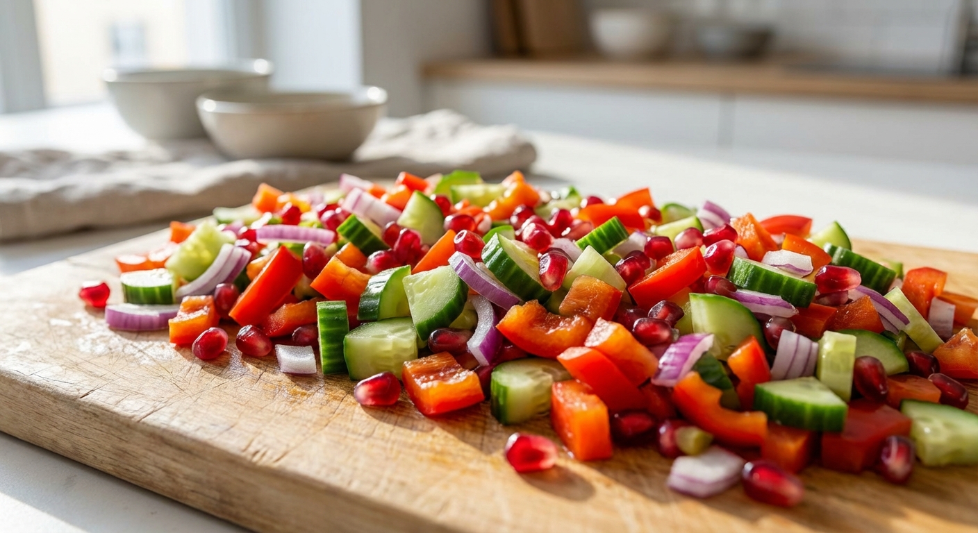 - Die Salatgurke, Cherrytomaten, Spitzpaprika und Frühlingszwiebel vorbereiten und in mundgerechte Stücke schneiden. Die Petersilie grob hacken. Die Granatapfelkerne aus dem Granatapfel lösen.