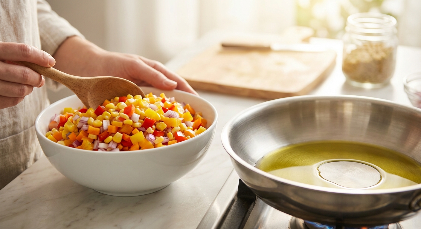 - 150 g Gemischtes Gemüse z.B. Paprika, Mais, Zucchini, gehackte Zwiebel