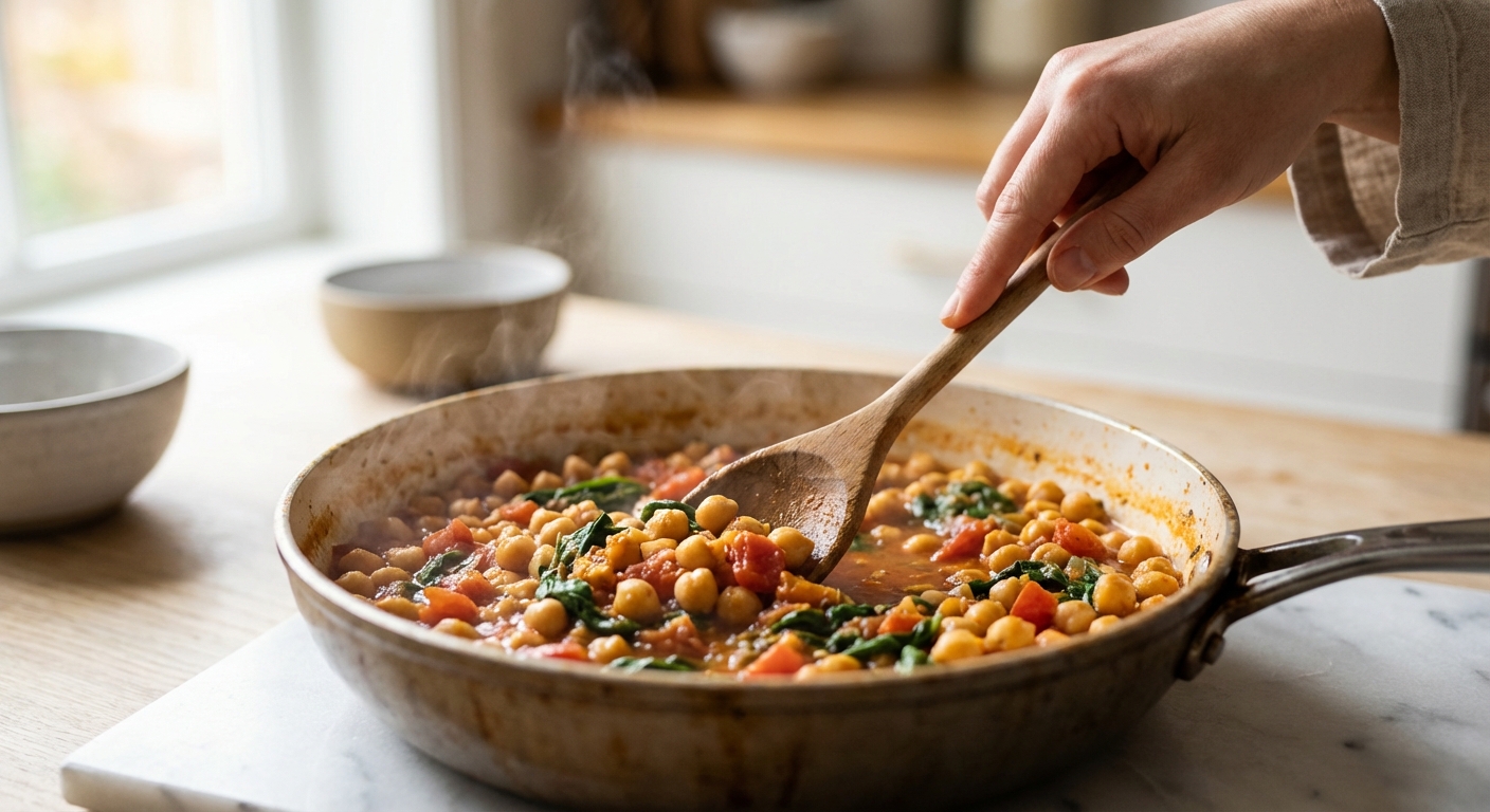 - Gib das gewürfelte Gemüse in die Pfanne und brate es für etwa 5-7 Minuten an, bis es weich ist. Rühre die abgetropften Kichererbsen, Kreuzkümmel, Paprikapulver, Salz und Pfeffer unter. Brate alles nochmals für 2-3 Minuten mit an.
