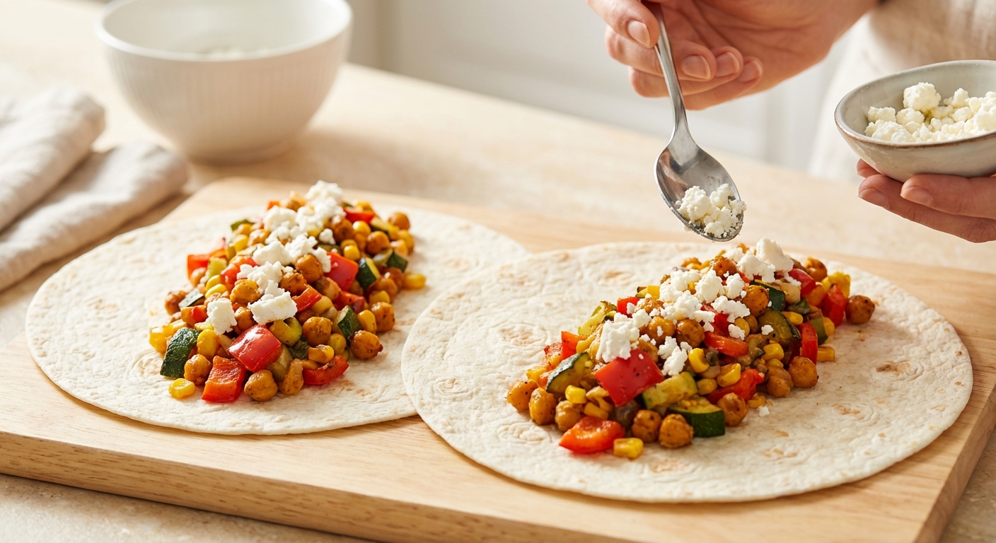 - Lege zwei Tortilla-Wraps auf eine saubere Arbeitsfläche. Verteile die Hälfte der Gemüse-Kichererbsen-Füllung gleichmäßig auf den Wraps, aber nur auf einer Hälfte jedes Wraps. Streue den zerbröselten Feta darüber.