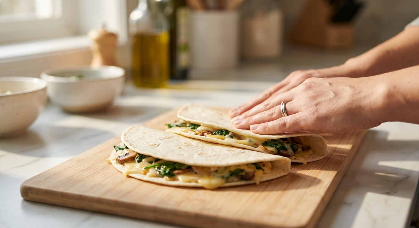 - Erhitze eine saubere Pfanne ohne Öl (oder mit einem Hauch Öl, falls nötig) bei mittlerer Hitze. Lege die gefüllten Quesadillas hinein. Brate sie für etwa 3-4 Minuten pro Seite, bis sie goldbraun und knusprig sind und der Feta leicht geschmolzen ist.