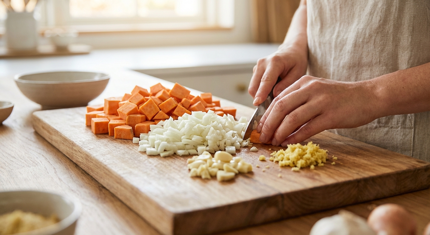 - Schäle die Süßkartoffeln und schneide sie in etwa 1-2 cm große Würfel. Hacke die Zwiebel, den Knoblauch und reibe den Ingwer fein.