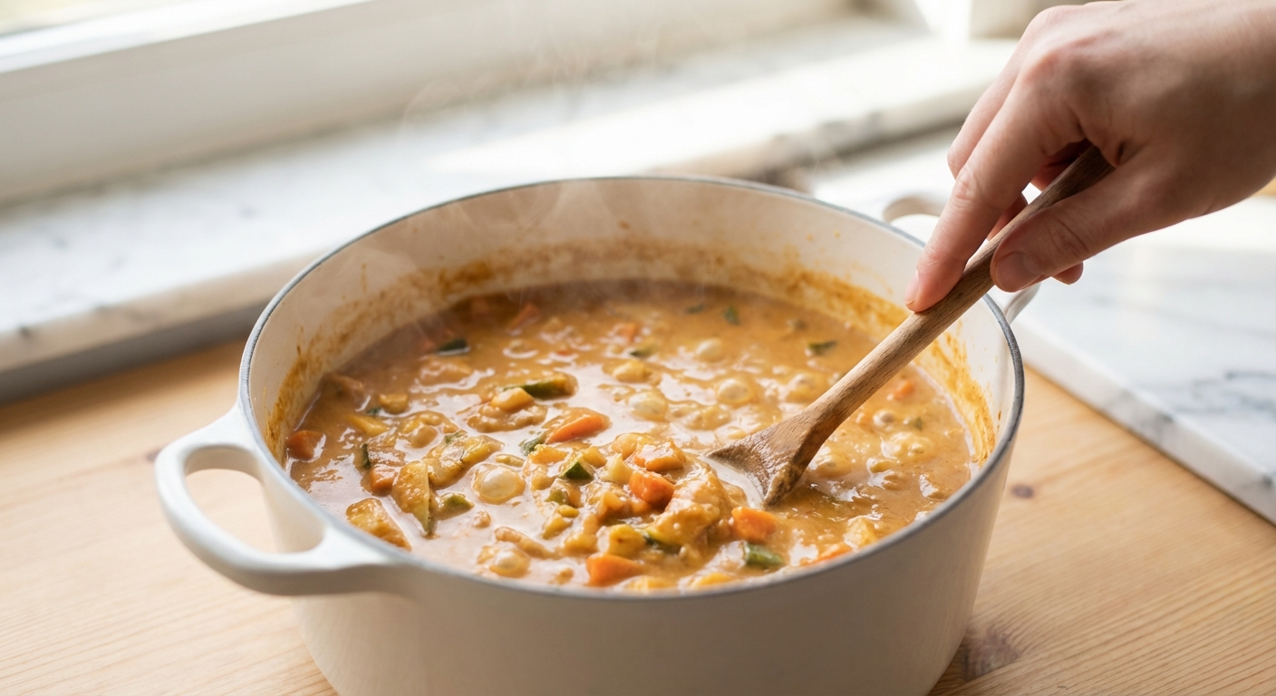 - Gieße die passierten Tomaten, die Kokosmilch Light und die Gemüsebrühe in den Topf. Rühre das Erdnussmus ein, bis es sich vollständig aufgelöst hat. Würze mit einer Prise Salz, Pfeffer und eventuell Chiliflocken.