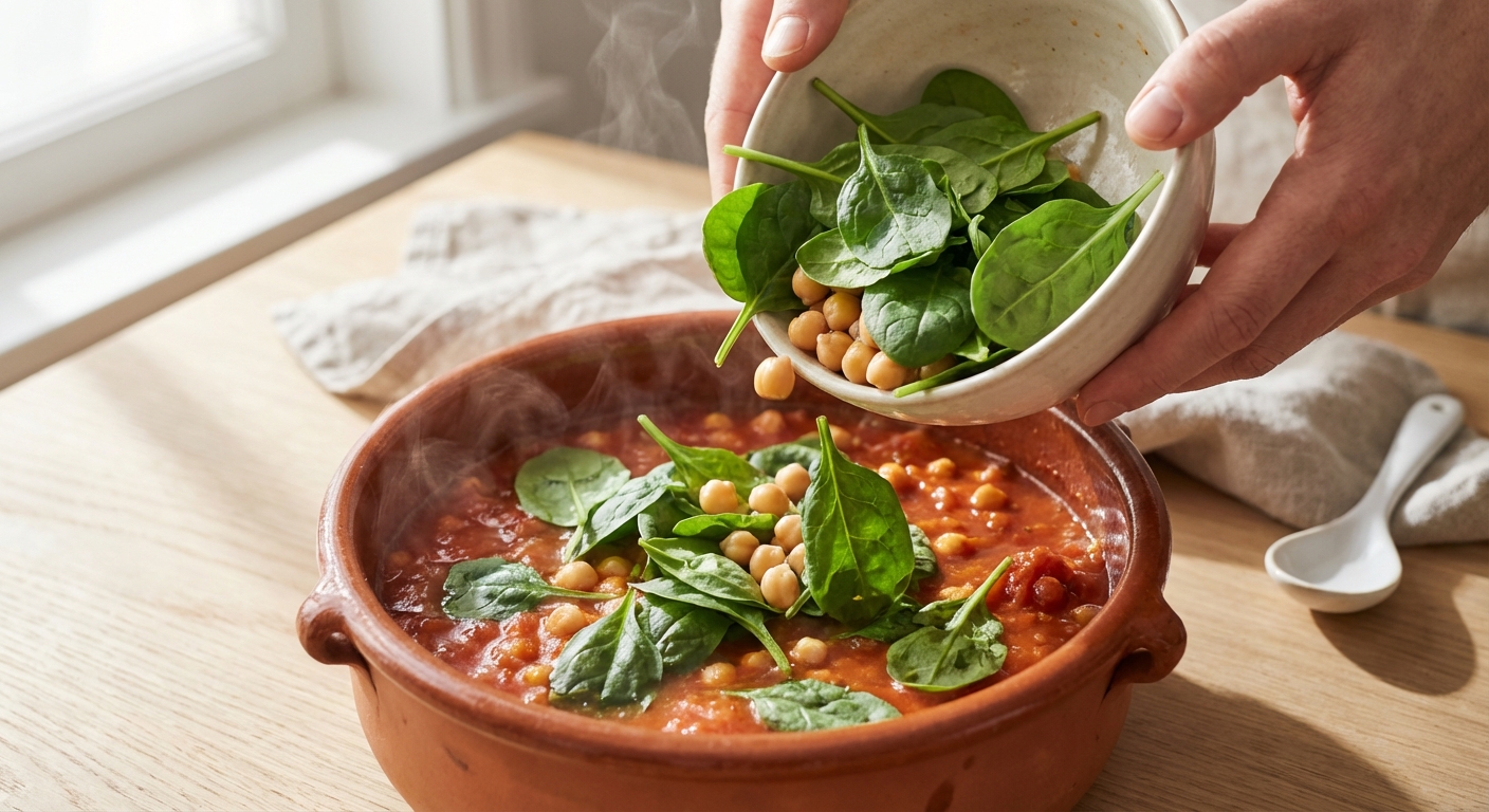 - Gib die abgetropften Kichererbsen und den frischen Spinat in den Eintopf. Lasse alles nochmals für 2-3 Minuten köcheln, bis der Spinat zusammenfällt.