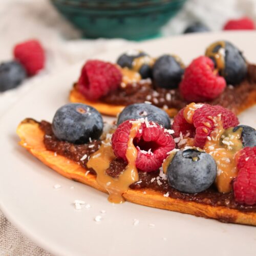 - Süßkartoffelscheiben mit Schokocreme bestreichen und Früchte darauf verteilen.
