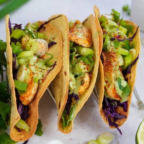 - Frühlingszwiebeln: Geben den Tacos einen milden, frischen Zwiebelgeschmack. Fein geschnittene rote Zwiebeln, Schnittlauch oder normale Zwiebeln in dünnen Streifen eignen sich als Alternative.