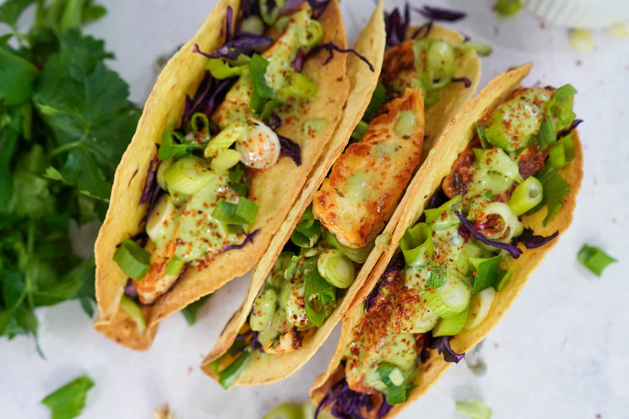- Frühlingszwiebeln: Geben den Tacos einen milden, frischen Zwiebelgeschmack. Fein geschnittene rote Zwiebeln, Schnittlauch oder normale Zwiebeln in dünnen Streifen eignen sich als Alternative.