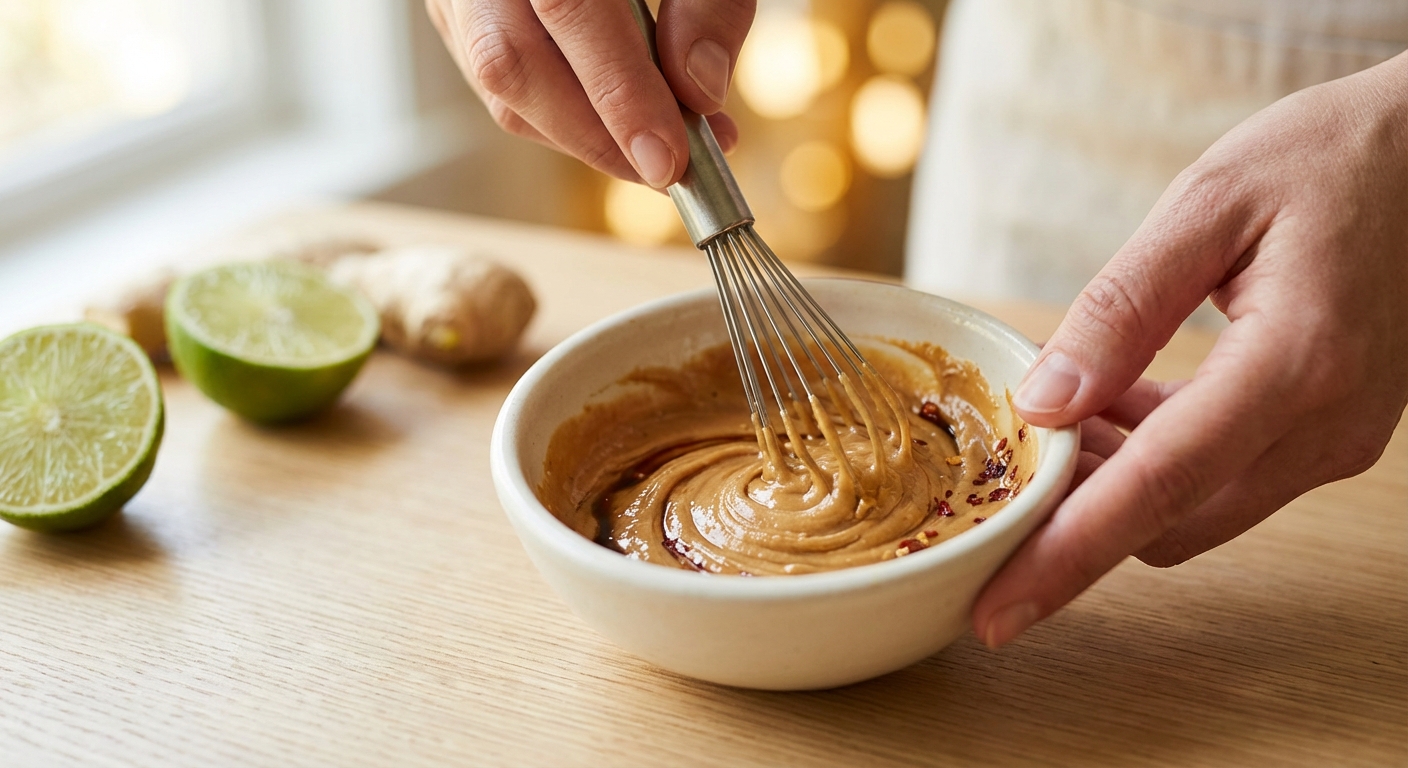 - Erdnussmus – Hier ist es wichtig, ein ungesüßtes Mus zu wählen. Es sorgt für die typisch asiatische Cremigkeit im Dressing und liefert gesunde Fette sowie Protein.