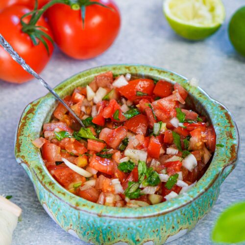 - Basilikum: Ich liebe das Aroma von Basilikum und es passt als Gewürz wunderbar zu Tomaten. So darf es in diesem leckeren Tomaten Salsa natürlich nicht fehlen. Ebenfalls dazu passt Koriander.