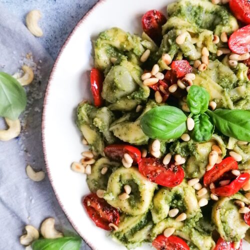 Tortellini mit selbstgemachtem Basilikumpesto und Pinienkernen