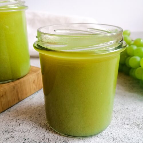 - Trauben waschen und gegebenenfalls entkernen. Ein Gefäß unter den Entsafter stellen und die Trauben durch den Entsafter pressen.