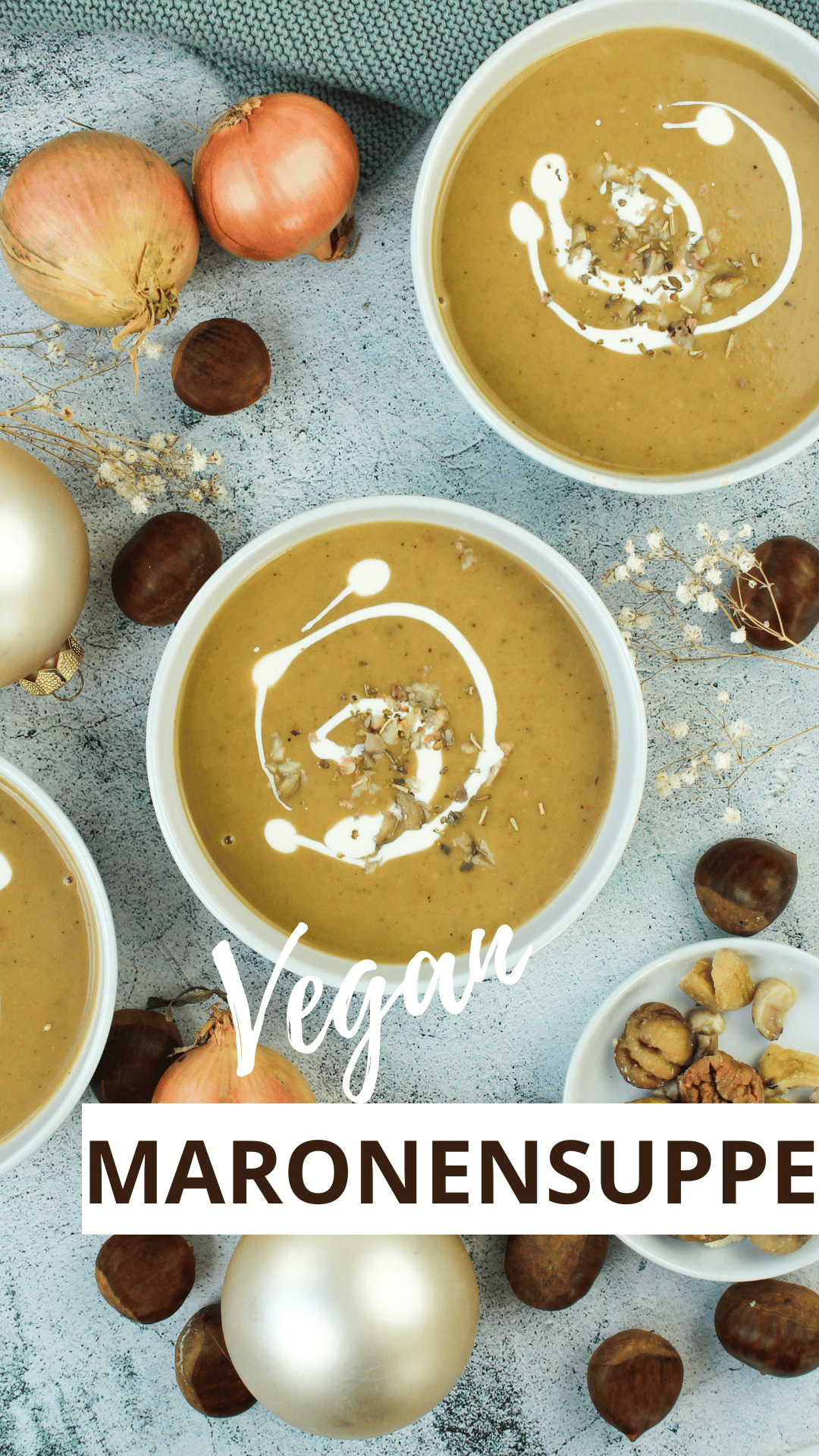 Hmm liebst du Maronen auch so sehr wie ich?  Vor allem im Herbst und Winter sind diese kleinen Leckerbissen fantastisch. Egal ob frisch aus dem Ofen mit einem Kräuterdipp oder in einem Gericht verarbeitet. Mit Esskastanien kann man so manches Gericht verfeinern. Der leicht süßliche Geschmack und die Kartoffel ähnliche Konsistenz passen einfach perfekt zur kalten Jahreszeit. In meinem Rezept habe ich die Maronen zu einer leckeren Suppe verarbeitet, die ohne Milch auskommt und somit sogar vegan ist.
