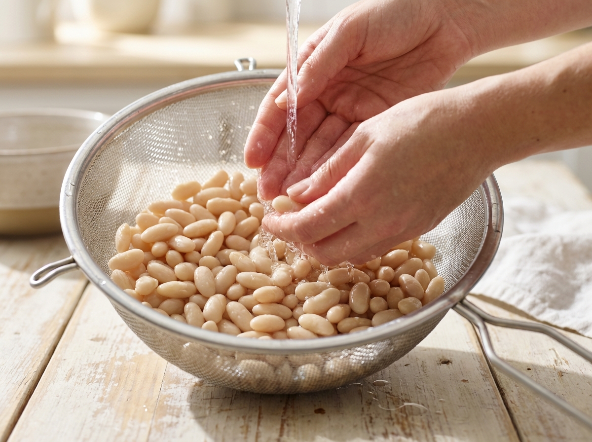 - Die weißen Bohnen in einem Sieb unter kaltem Wasser abspülen und gut abtropfen lassen.