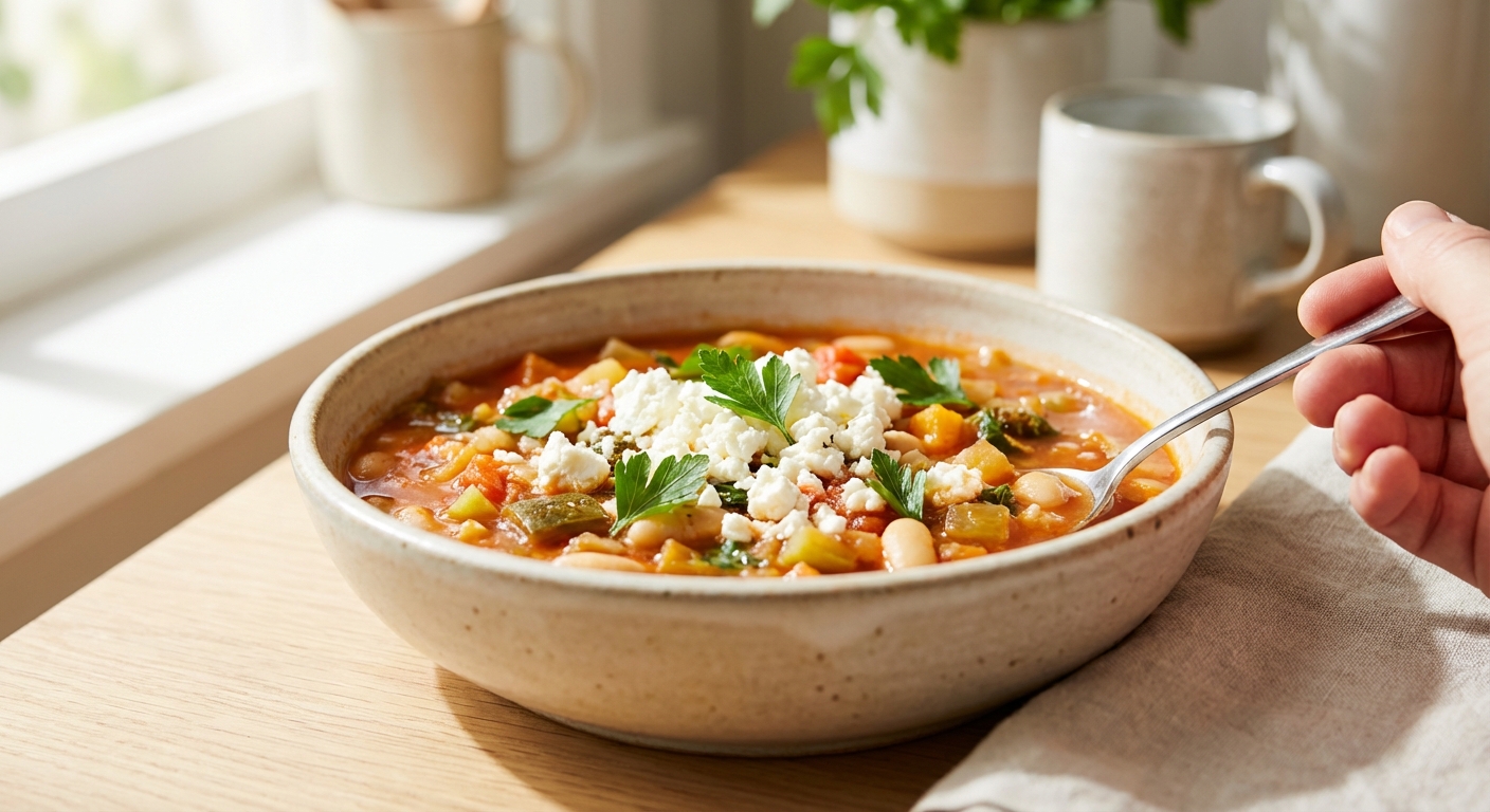 - Macht lange satt und ist proteinreich – Dank der weißen Bohnen und des Fetakäses ist diese Suppe eine wahre Proteinbombe. Das hält dich lange satt und beugt Heißhungerattacken vor.