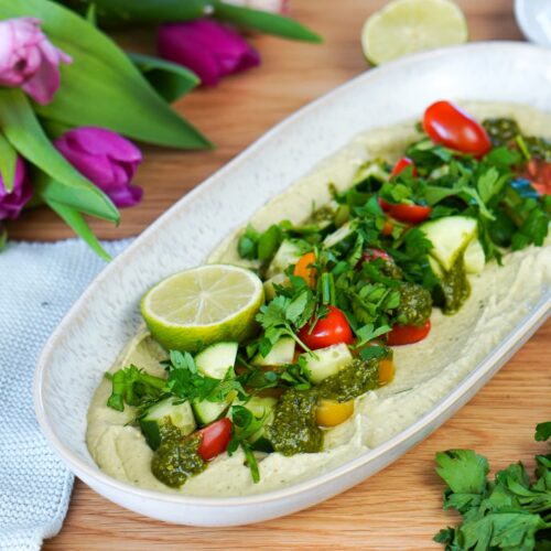 Wenn du möchtest kannst du noch frisches Gemüse wie Zucchini, Tomaten und Gurken als Deko verwenden. Auch frische Kräuter machen sich super auf dem Dip und geben ihm nochmal einen extra Geschmack.