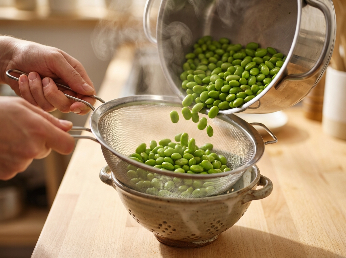 - Bringe Wasser für die Edamame zum Kochen. Sobald das Wasser kocht, gib die tiefgekühlten Edamame hinein und koche sie für etwa 3-4 Minuten. Gieße sie danach ab und schrecke sie kurz mit kaltem Wasser ab.